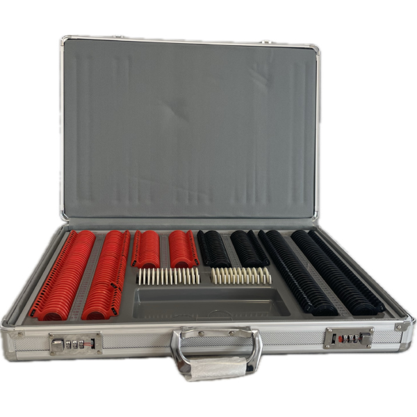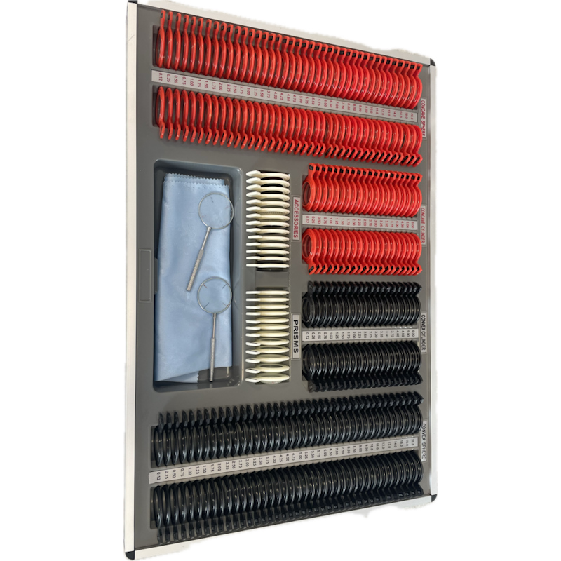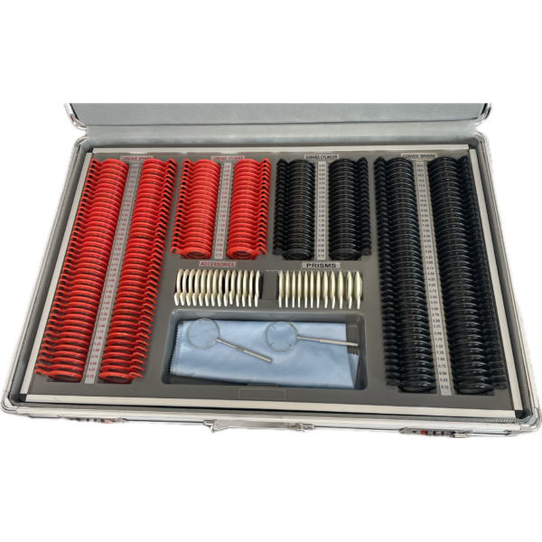Kaseta okulistyczna 266 szkieł w oprawie plastikowej , w walizce metalowej Pole widzenia przez soczewkę 26 mm całkowita średnica soczewki wraz z ramką 38 mm. Wkład z soczewkami umieszczony w metalowej walizce można wyjąć i osadzić np. w szufladzie unitu okulistycznego , bądź w dedykowanej szafce, wymiary wkładu 53 cm x 31 cm x 5 cm Oprawy próbne nie są na wyposażeniu kasety
