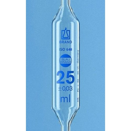 BLAUBRAND®. Zgodne z normą DIN EN ISO 648. Oznaczenie DE-M i nadrukowany numer serii. Podziałka i napisy wykonane trwałą, niebieską, wysoce kontrastową emalią. Wzorcowane na wylew (TD, Ex). Wszystkie pipety jednomiarowe BLAUBRAND® z certyfikatem serii dołączonym do zbiorczego opakowania (do pojemności 2 ml_/12 sztuk, od pojemności 2,5 mL/6 sztuk). Certyfikat serii dostępny również na stronie producenta. Na życzenie dostępne są także z certyfikatem indywidualnym lub certyfikatem kalibracji DAkkS (dawniej DKD).