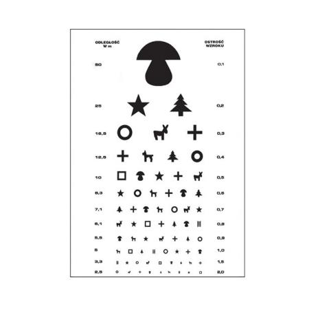 Tablica Snellena obrazki grzybek karton to przyrząd do wykonywania badania optometrycznego. W trakcie badania pacjent staje w odległości 6 metrów od tablicy. Tablica składa się z dwunastu rzędów obrazków, a najmniejszy rząd, który pacjent jest w stanie odczytać z tablicy określa ostrość wzroku pacjenta w danym oku. Gwarancja producenta wynosi 12 miesięcy.