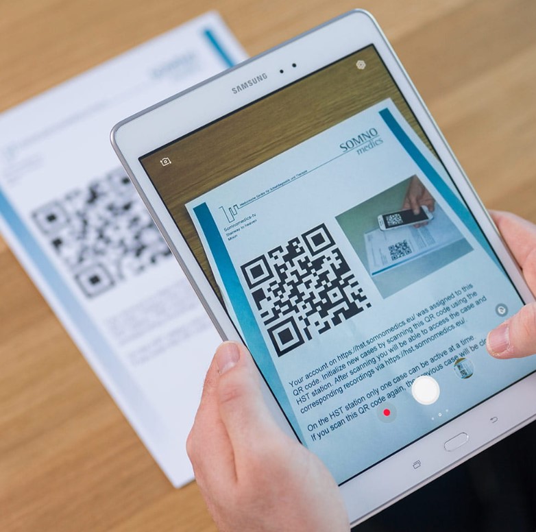 Tablet poprowadzi pacjenta przez aplikację czujnika. Automatycznie rozpoznaje, który z dwóch systemów HST jest używany i wyświetla odpowiednie filmy wideo dotyczące aplikacji. Po rozpoczęciu badania wszystkie dane z czujnika przesyłane są do tabletu poprzez Bluetooth. Chrapanie rejestrowane jest za pomocą mikrofonu tabletu.